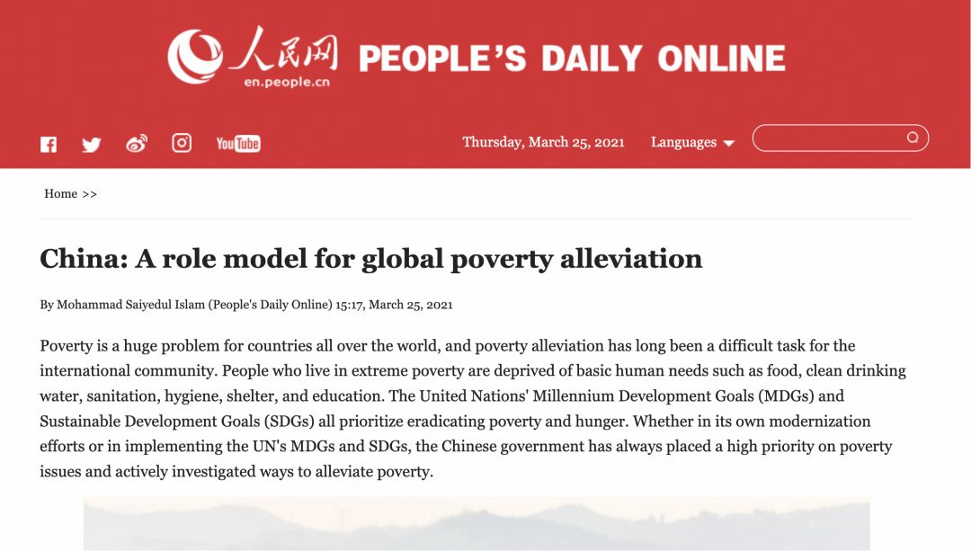 2021年,江西财经大学国际经贸学院在读博士生,来自孟加拉国的Saiyedul(中文名吴迪),在《人民日报》署名发表了《中国:全球扶贫的榜样》,不过,文章发表在人民日报英文版,属于外宣。