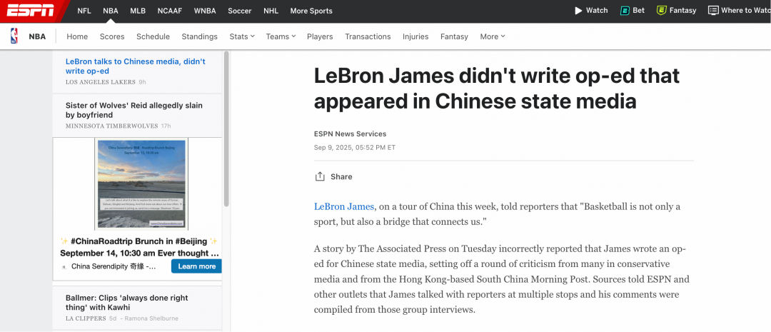 如果在十年前,或者更久之前,这个“署名文章”不会引发波澜,但现在美联社以署名文章为由,先报道了“詹姆斯的中国行是篮球外交”,然后又澄清,说这并非詹姆斯投稿,而是《人民日报》媒体编辑整理刊登,撤回了原来的报道。