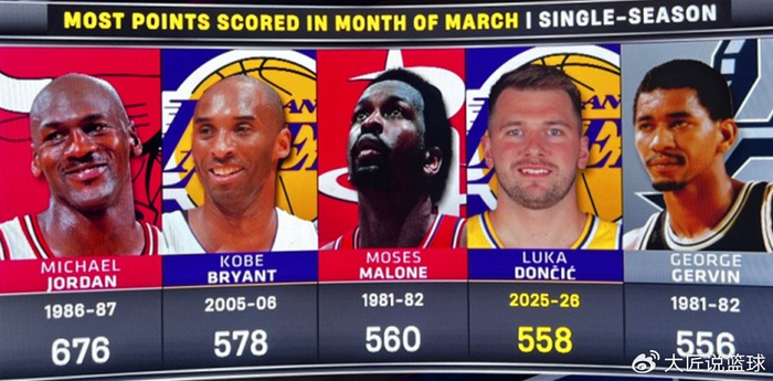 本场比赛结束后,3月份东契奇总得分定格在600分,成为NBA历史上第二位在三月份总得分达到600分大关的球员,比肩篮球之神乔丹,期间东契奇场均可以交出37.5分8板7.4助2.3断。